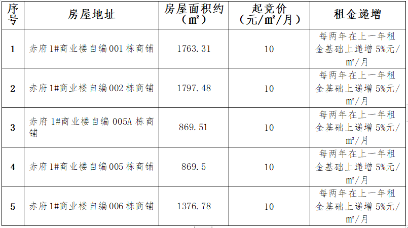 南昌金开枫林物业管理有限公司就南昌经济技术开发区赤府安置房小区1#商业楼2栋、2#商业楼3栋共计5栋独栋商铺对外公开进行出租经营权竞拍,现对有关事项公告如下:一、本次竞拍承包的房屋如下: