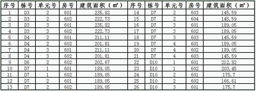 | 26 | 商业2-2#-1-203 | 57.25 | 66 | 商业2-5#-1- 0112 | 50.54 | 106 | 商业2-7#-1- 0110 | 255.17 |