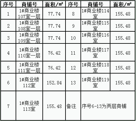 | 序号 | 商铺号 | 面积/㎡ | 序号 | 商铺号 | 面积/㎡ | 序号 | 商铺号 | 面积/㎡ |