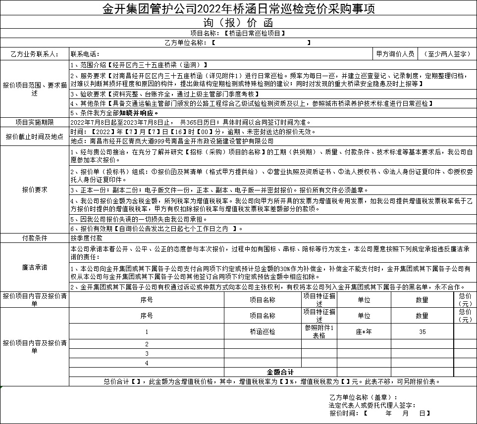 桥涵日常巡检竞价采购公告