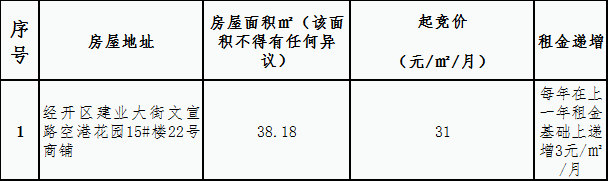 南昌金开枫林物业管理有限公司就南昌经济技术开发区空港花园安置房小区15#楼22号商铺对外公开进行出租经营权竞拍,现对有关事项公告如下: