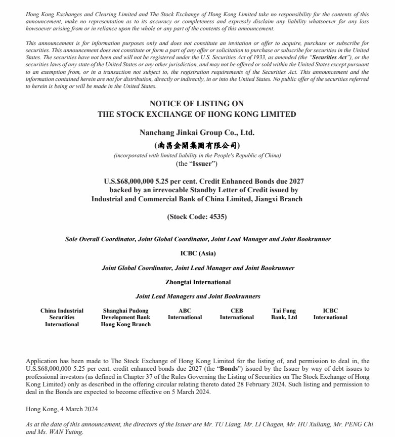 南昌金开集团有限公司2024年第一期境外债发行公告