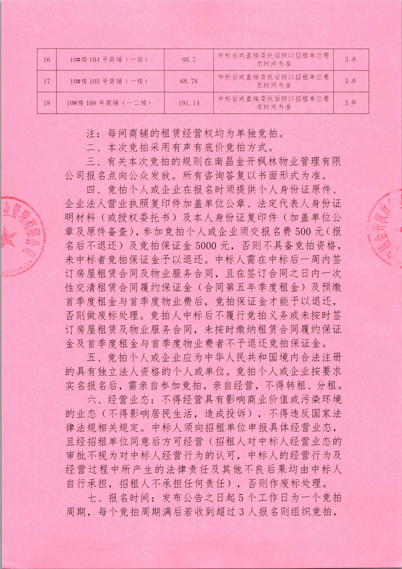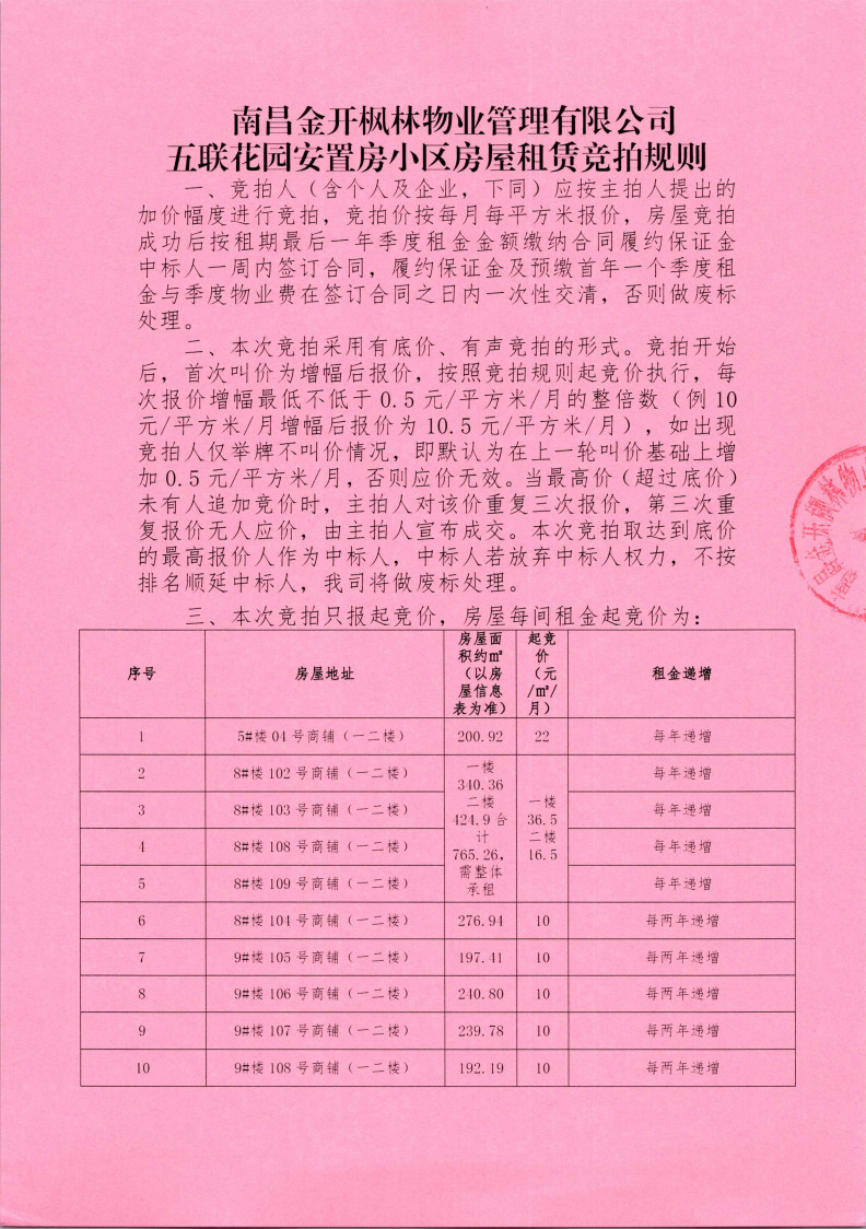 南昌金开枫林物业管理有限公司五联花园安置房小区房屋租赁竞拍公告