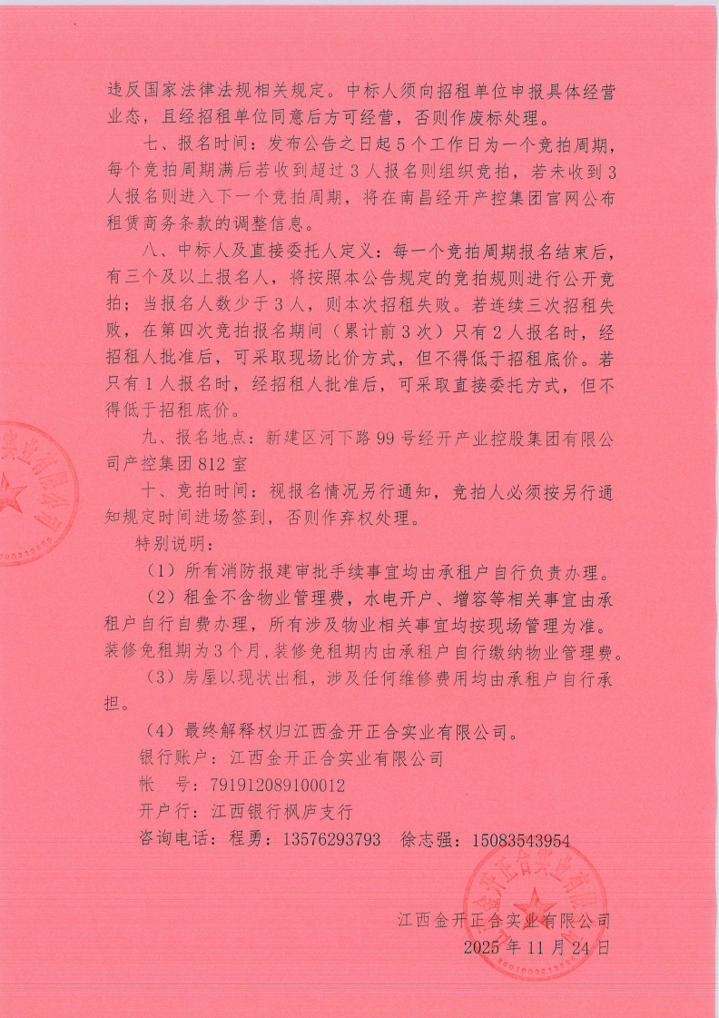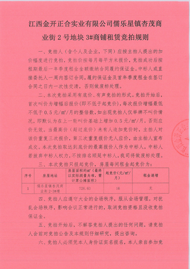 江西金开正合实业有限公司儒乐星镇杏茂商业街2号地块3#商铺租赁竞拍公告