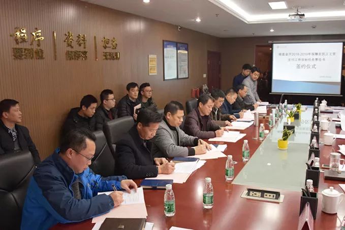 会上,集团工程部部长刘宗财传达了全市农民工工资“治欠保支”和全区安全生产工作会议精神,要求下属各公司严格贯彻落实会议精神。随后,为进一步传导压力,层层落实责任,集团分别与下属各公司签订了安全生产责任书和2018-2019年保障农民工工资支付工作目标任务责任书。