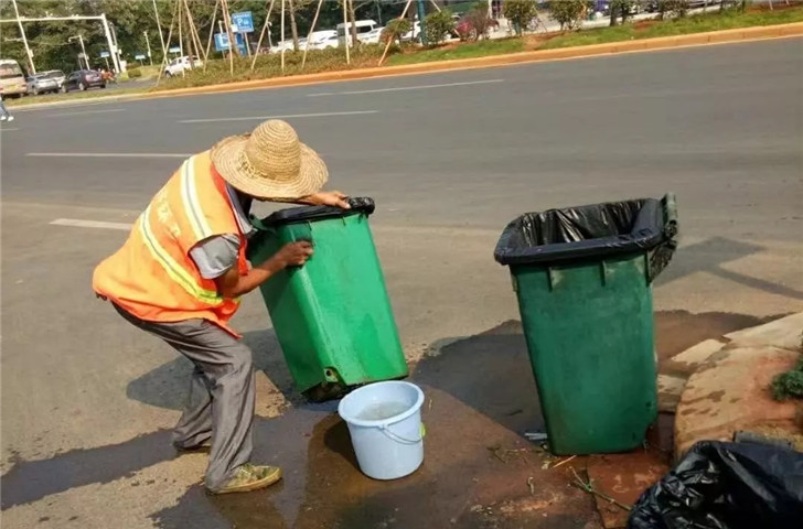 安排环卫工人专人专桶,定期对所辖范围内垃圾桶及底部进行清掏抹洗。要求对辖区内垃圾做到垃圾日产日清,不得乱倒乱卸,收集垃圾后,将垃圾桶及时复位,清扫作业场地,做到车走场净。