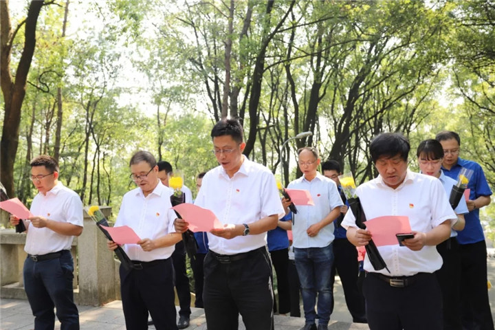 巍巍青山、苍苍翠柏,沐浴在秋日阳光下的方志敏烈士陵园庄严肃穆。怀着无比崇敬的心情,同志们在毛泽东主席亲自题字的方志敏烈士墓前肃立默哀三鞠躬。随后,面对鲜红的党旗,举起右手、握紧拳头,庄严宣誓。在诵读方志敏烈士文章——《可爱的中国》节选后,同志们缓步绕行瞻仰方志敏烈士墓,神情肃穆而坚定。