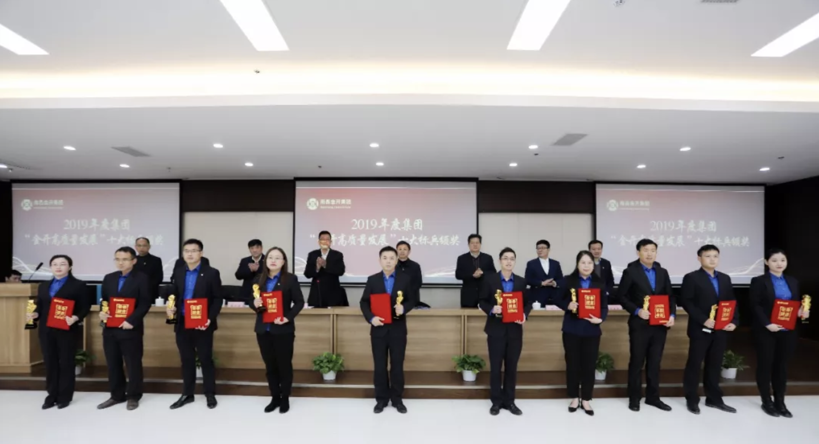 程建兵及集团领导班子为2019年度集团“金开高质量发展”十大标兵颁奖并合影留念。随后,2名优秀员工代表发表了获奖感言。