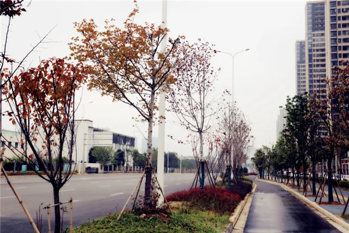 据了解,青岚大道路线全长约5km,路幅宽为48m,是一条贯通经开区,直通新建区、红角州的主要交通通道。改造前青岚大道双向四车道,未设置人行道和非机动车道,存在人车混行、机非混行情况;且路面破旧、架空线路多、绿化单一。本次对青岚大道进行全方面的改造,主要涵盖了路面“白改黑”、架空线缆“上改下”、路灯“暗改亮”、苗木“绿改彩”等。