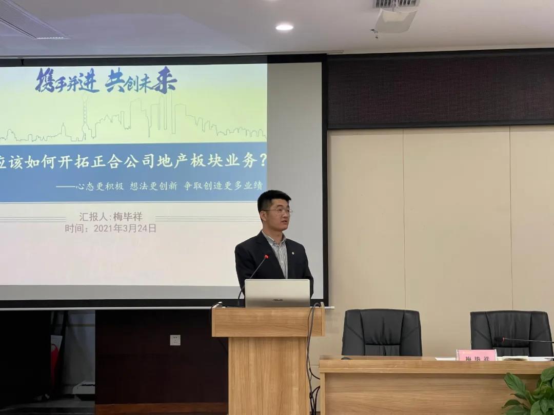 3月24日下午,金开集团首场房地产开发业务交流培训会在集团108会议室召开。正合公司副总经理梅毕祥受邀作了主题为《我们应该如何开拓正合公司地产板块业务?——心态更积极,想法更创新,争取创造更多业绩》的专题授课。集团党委书记、董事长谢荣华,集团党委委员、副总经理李茶根,集团党委委员、纪委书记方义发出席,集团相关部门负责人及正合公司全体人员参加。