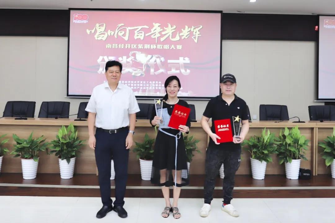 6月28日,南昌经开区紫荆杯“唱响百年光辉”歌唱大赛颁奖典礼在金开集团108会议室举行。区工会主席雷惠珍,集团党委书记、董事长谢荣华,集团党委副书记、副总经理袁扣华分别为获奖选手颁发了荣誉证书和奖杯,此次歌唱大赛正式圆满落幕!