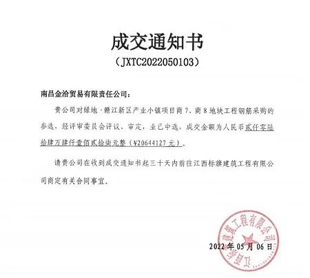 ➤ 中国华冶绿地CBD水泥采购项目、抚州金溪江西鑫科环保钢筋采购项目及景德镇滨江路网钢筋采购项目,合同金额合计约4550万元。