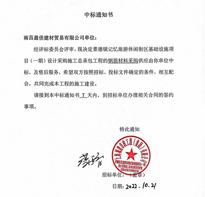 10月21日,南昌盈佳建材贸易有限公司成功中标上海城建市政工程(集团)有限公司景德镇记忆旅游休闲街区基础设施项目(一期)钢筋项目(约2300吨钢筋,中标金额约980万元)。