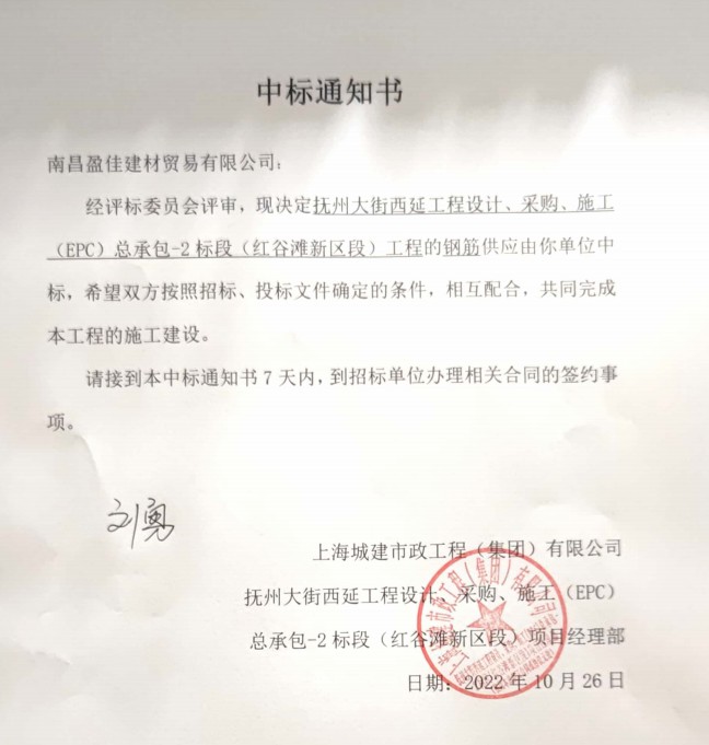 10月26日,南昌盈佳建材贸易有限公司成功中标上海城建市政工程(集团)有限公司抚州大街西延工程设计、采购、施工(EPC)总承包-2标段(红谷滩新区段)工程钢筋项目(约2500吨钢筋,中标金额约1060万元)。