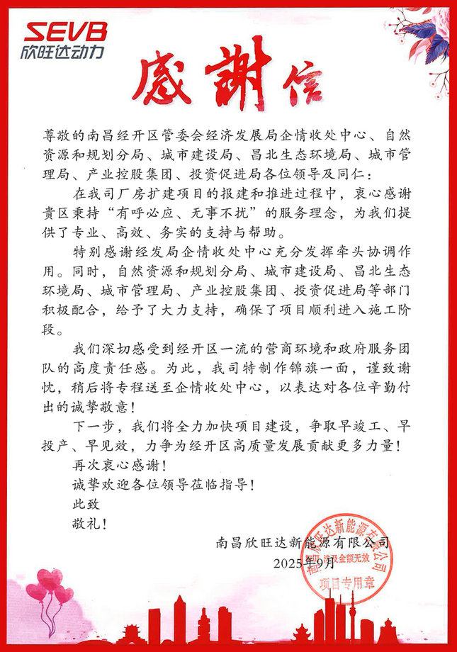 9月4日,集团收到了来自南昌欣旺达新能源有限公司的一封感谢信,信中南昌欣旺达新能源有限公司对集团在推进欣旺达厂房扩建项目中提供专业、高效、务实的支持与帮助给予了高度评价和诚挚感谢。