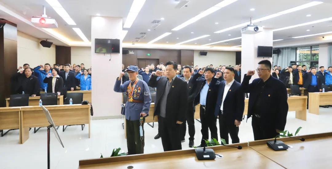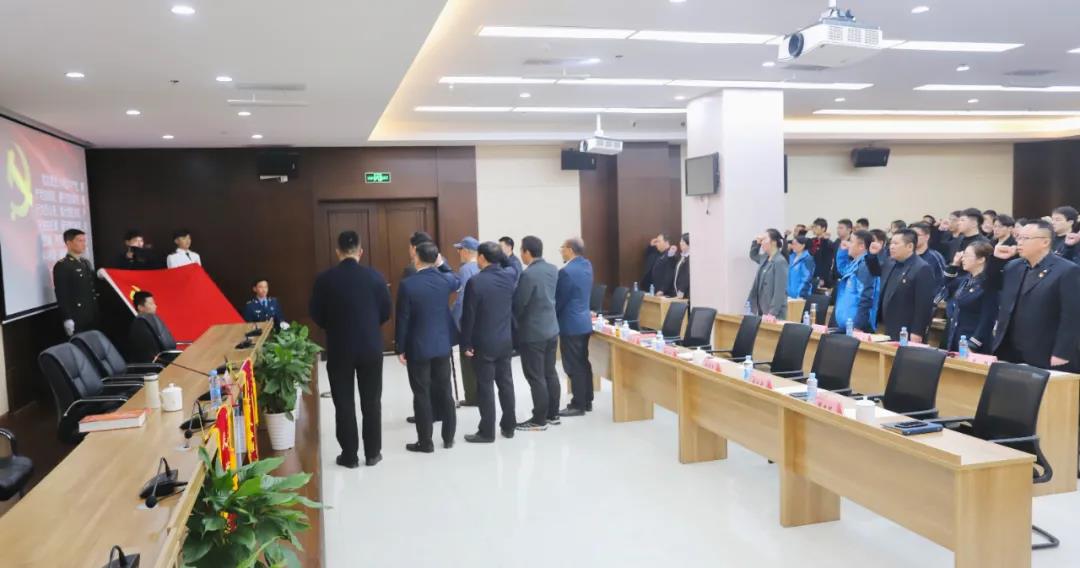 最后,集团全体党员重温入党誓词,谢荣华与印老带领大家一起面对党旗、高举右手,一字一句、字字千钧,严肃认真、慷慨激扬地庄严宣誓,重温入党初心使命,激励同志们不忘初心、牢记使命、永远奋斗,为党为国、为集团高质量发展再立新功。